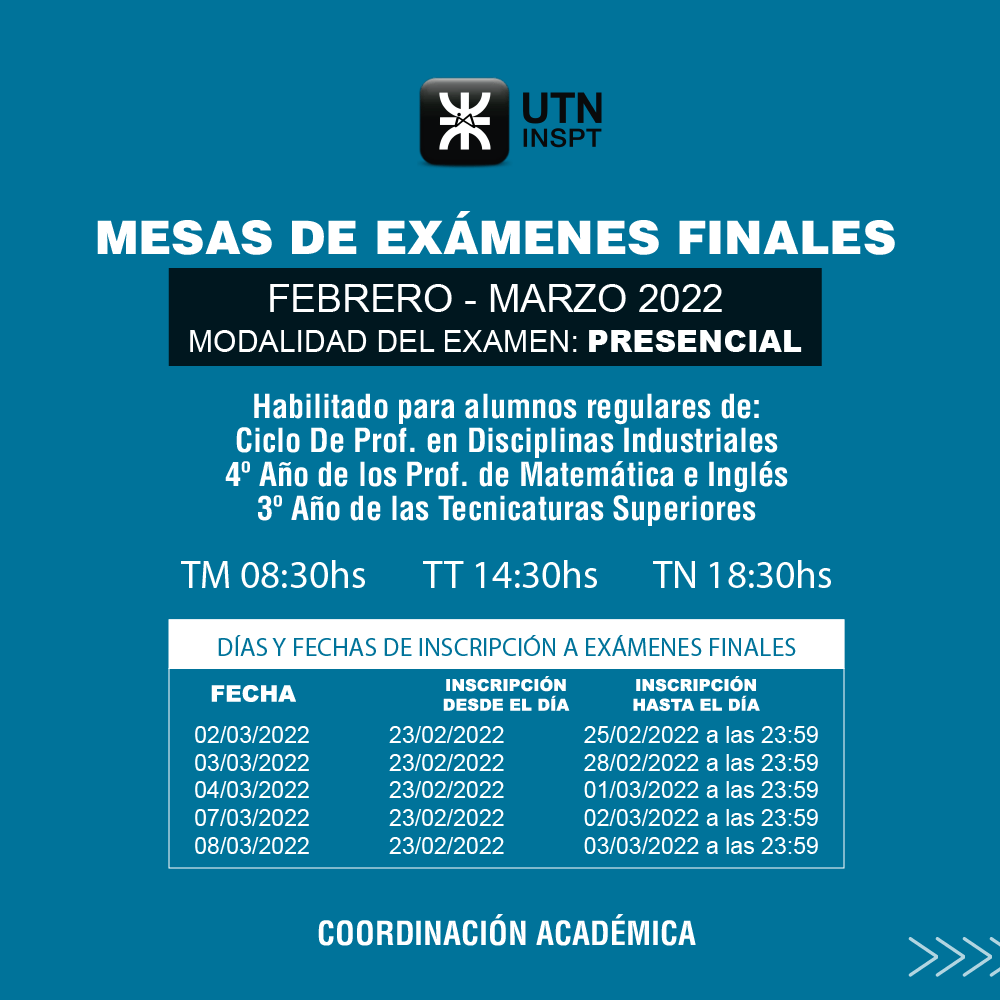 Mesas de exámenes para Ciclo de profesorado en Disciplinas Industriales, 4° año de los profesorados de Matemáticas e Inglés y 3° año de las Tecnicaturas Superiores.