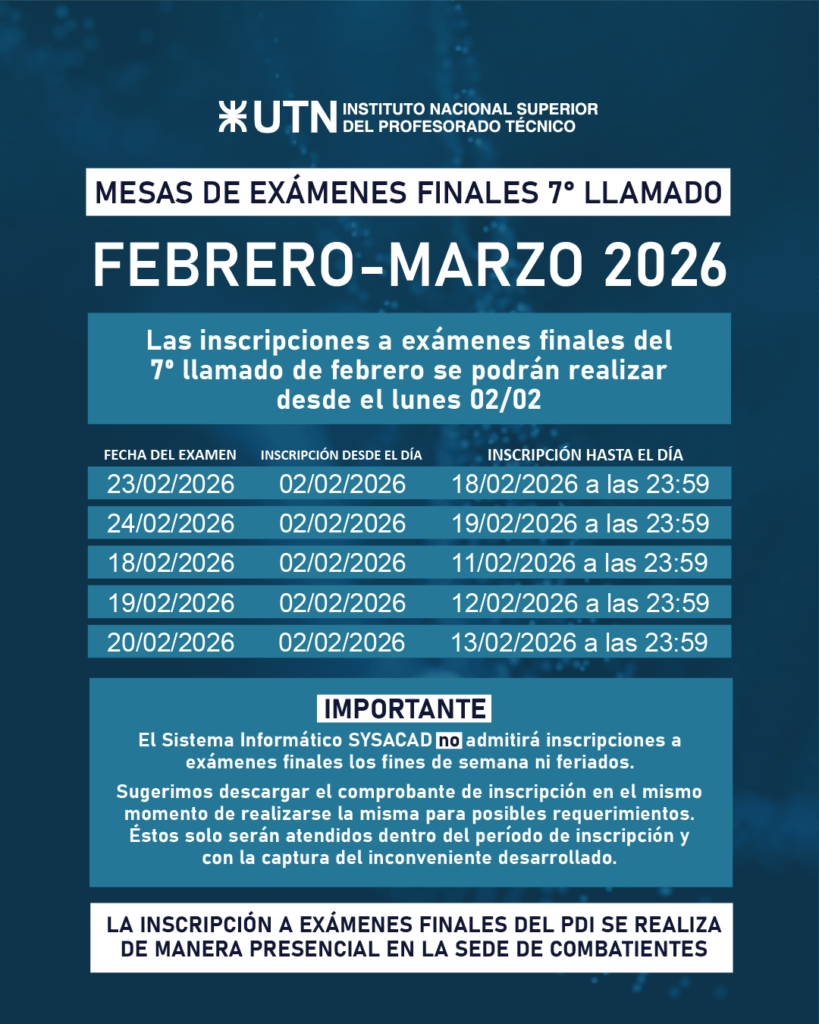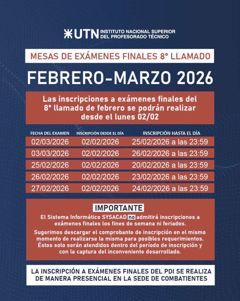 Exámenes finales Febrero-Marzo 2026 Ene 26, 2026Ya se encuentran todas las mesas en nuestro sitio web. ¡¡Muchos éxitos!!